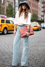 Here is a lightwash that still embraces the signature high-waisted bell bottom look while adding modern style with a loosely tucked in blouse. Notice the absence of bold colors for this day time ensemble. The color from the clutch is enough to break up the laid back tones and the leather belt is reassurance of the 70s vibe. At the boutique I buy for these big hats have been a hit; wearing your hair down in the all too wonderful 70s waves with a wide brimmed hat like this pull from several style eras all while giving a "feminine, stylish and hippie" feel, which is beauty in one of its most fun tudes.